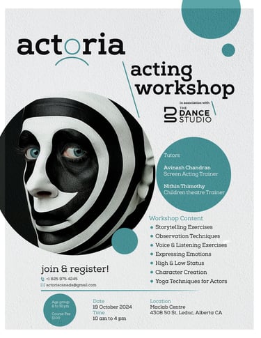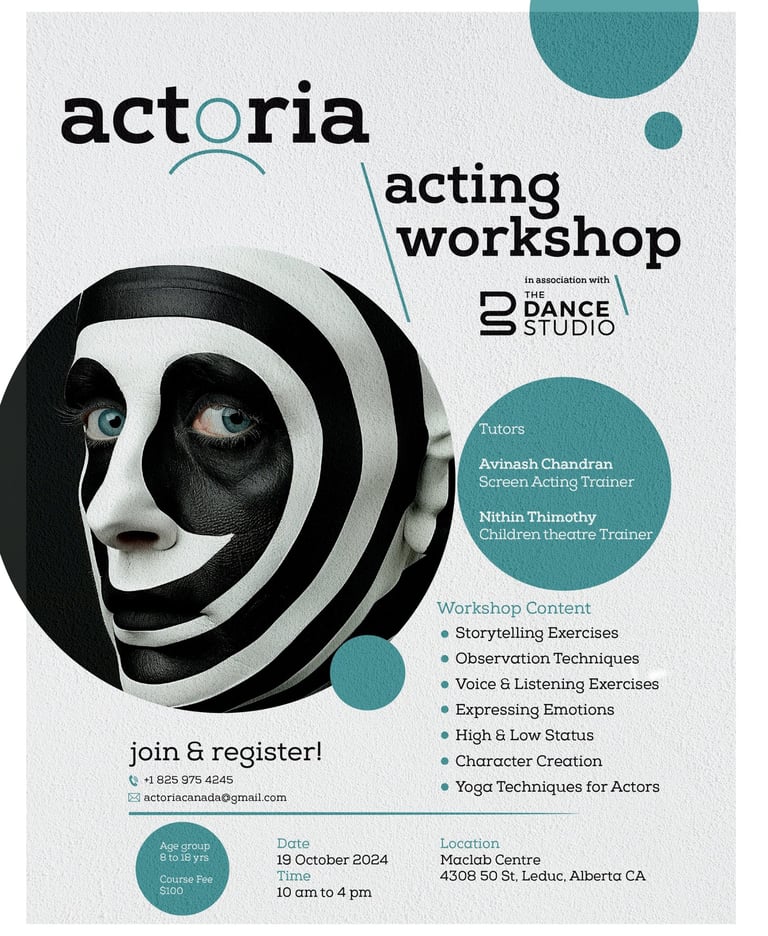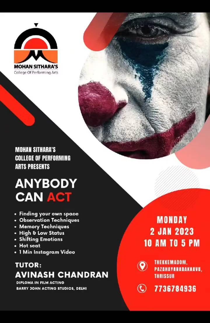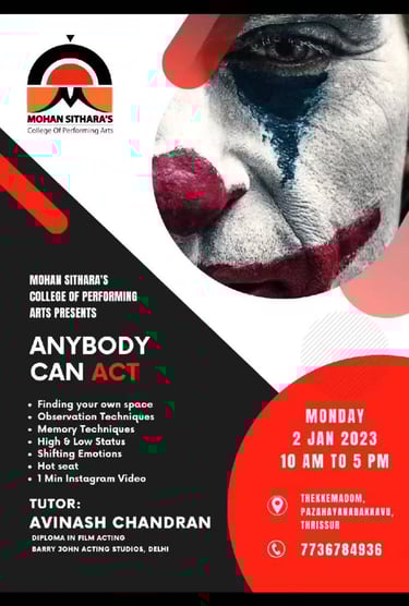 "ANYBODY CAN ACT" is an acting workshop designed by Avinash Chandran to make the art of acting accessible to everyone, regardless of their background or experience level. The workshop focuses on unlocking participants' innate potential through practical exercises, creative exploration, and personalized guidance. It emphasizes that with the right techniques and mindset, anyone can tap into their ability to act, making the art form approachable and enjoyable for all. The workshop is structured to build confidence, enhance communication skills, and encourage self-expression, making it an empowering experience for all participants
